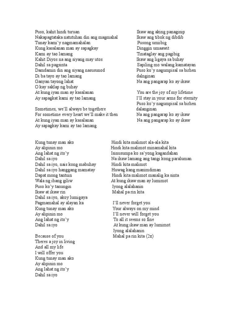 7222017 Tanging ikaw sinta ang aking pag-asa Dahil sa iyo nais kong mabuhay Dahil sa iyo hanggang mamatay Dapat mong tantuin wala nang ibang giliw Puso koy tanungin ikaw at ikaw rin Dahil sa iyo akoy lumigaya Pagmamahal ay alayan ka Kung tunay mang ako ay alipinin mo Ang lahat ng itoy dahil sa iyo Kung tunay mang ako ay alipinin mo Ang lahat sa buhay koy dahil sa iyo. 1092020 October 9 2020. Dahil sayo ohhh ohhh ohhhhh.